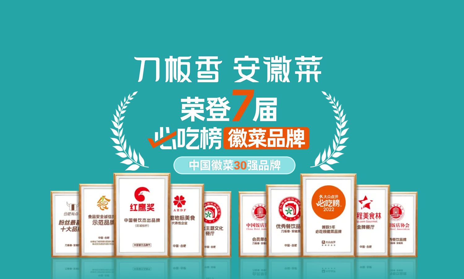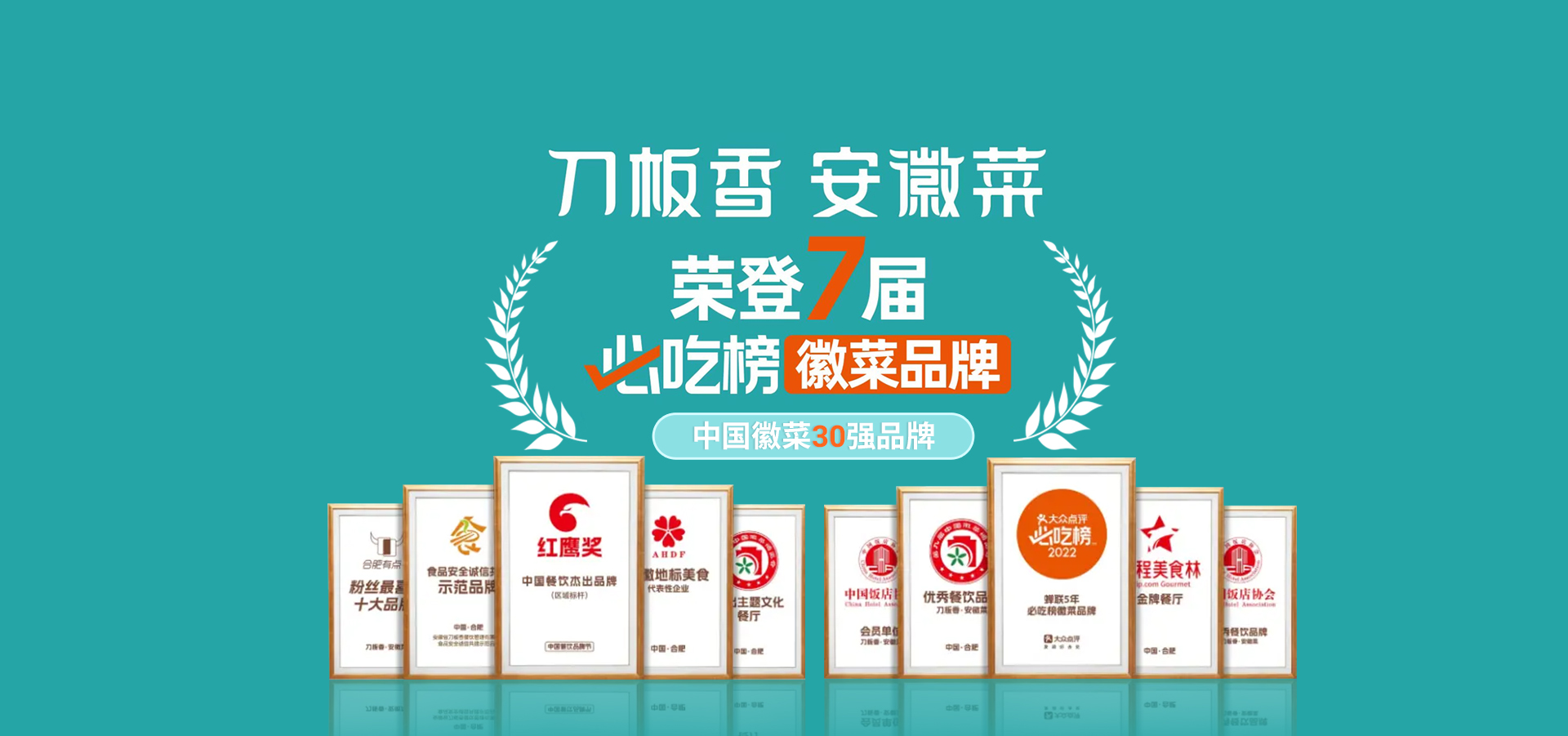刀板香先后荣获安徽餐饮TOP10商家、中国徽菜品牌TOP30、安徽优秀连锁餐饮品牌、合肥市民喜爱人气餐厅等各项殊荣,是连续6年,蝉联大众点评必吃榜餐厅的徽菜品牌,也是2018年,安徽省餐饮服务标准化唯一示范企业。